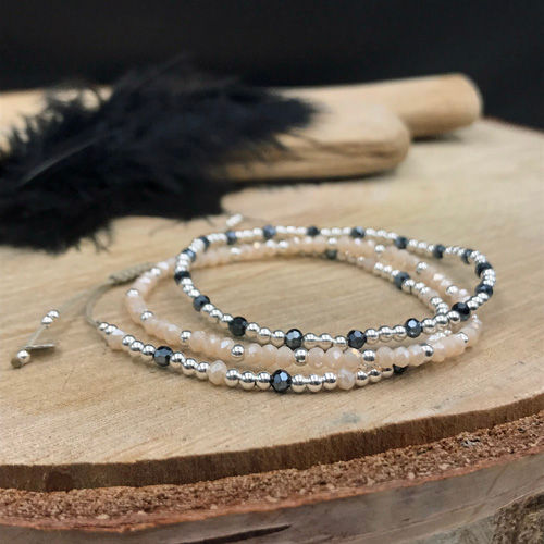 Bracelet perles argent 2.5 mm et perles cristal gris, beige et noir