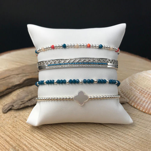 Bracelet perles argent 2.5 mm et perles cristal bleu, beige et noir